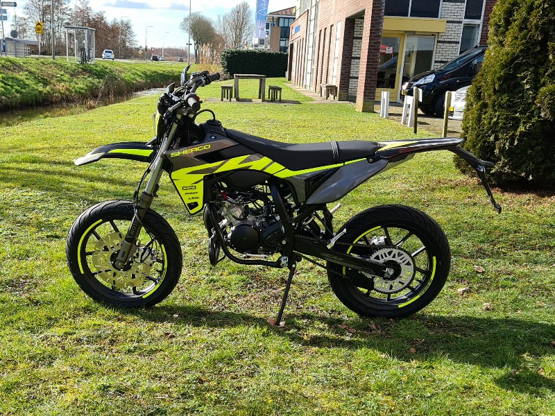 De Sherco RR 50 Supermoto uit Frankrijk heeft zich inmiddels jaren bewezen in kwaliteit en duurzaamheid met het bekende Minarelli AM6 motorblok. Door het lichte gewicht, goede stuureigenschappen en prachtige ontwerp onderscheiden deze Sherco bromfietsen zich ten opzichte van de rest.